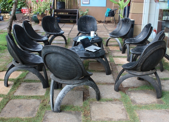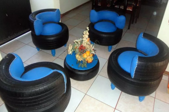 Второй вариант тоже не менее простой с одной стороны покрышки закрываются фанерными кругами и вставляются подушки соответствующего размера, сверху прикрепляется пол ската с вставленной подушкой, колбасой, валиком, а столик это просто перевёрнутый закрытый фанерой скат.