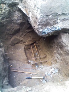 В траншею укладываем железнодорожные б/у шпалы (с креозотом) опускаем гараж, просверливаем отверстия в уголках (нижняя обвязка) каркаса гаража, крепим его анкерами.
