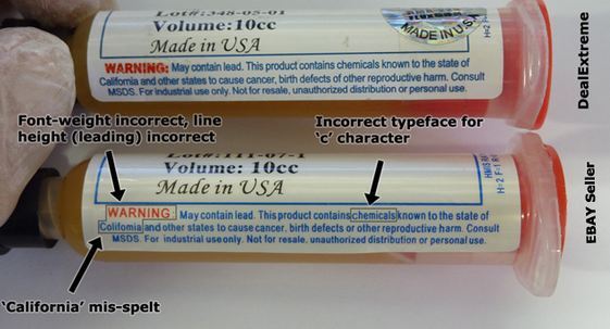 Купить его без проблем можно на том же Али.экспресс, правда настоящий Amtech приобрести возможно и не получится, но для пробы, чтобы познакомиться с флюсом, вполне достаточно и изделия китайского производителя. Есть он и на eBay или том же DealExtreme. На сайте Amtech можно посмотреть на настоящий флюс, тот же RMA-223 выпускается в основном в 10-мл по объему тюбиках. Вот, кстати, визуальное сравнение подделки с оригиналом: