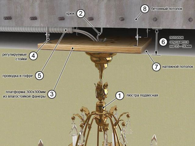 Ничего страшного не случится. Дело в том, что все будет зависеть от формы и размера помещения. Конечно же люстру можно повесить, и при выключенном электрическом питании, никакого замыкания не произойдет. Как Вы можете теперь понять, что только при включенном питании может произойти замыкание, поэтому, если Вы видите, что вода поступает с потолка, то не включайте свет.