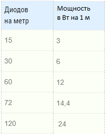 Что касается мощности этой ленты, то этот показатель "завязан" на плотности (количестве светодиодов на метр длины) ленты, вот таблица для примера,