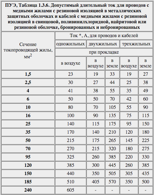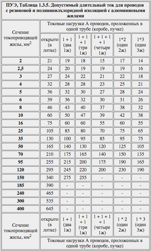 В интернете содержится огромное количество таблиц, содержащих информацию о допустимых токах для медных или алюминиевых проводов всех сечений, так же они как правило имеются и на бумажных носителях в учебниках по электротехнике и различных справочниках электрика.