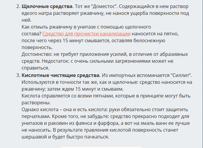 Но вся штука в том, что через небольшой промежуток времени всё повторится снова, у вас видимо старые трубы, по которым поступает вода и они дают вам большую порцию ржавчины. Кроме того ржавчина будет так же откладываться и под ободком унитаза, откуда удалить её крайне трудно. Решить этот вопрос можно с помощью дополнительного фильтра, встроенного в систему подачи воды в бачок, поставьте 1 микронный картридж, это должно решить проблему радикально. Т.к. фильтр будет стоять только на унитаз, его вам хватит очень-очень на долго.