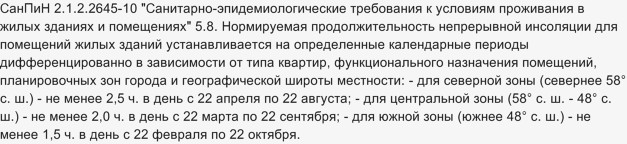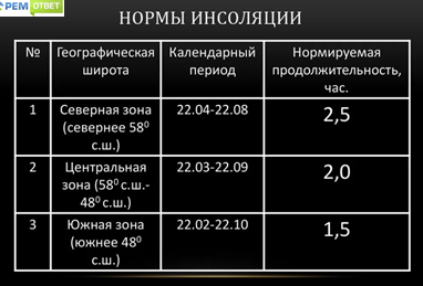 Например для северной зоны (двух, трех комнатная квартира) 2,5 часа в сутки и это минимум помещение должно быть освещено солнечным светом.