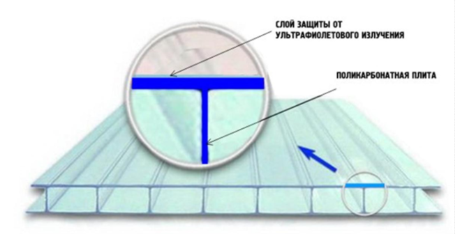 Но могут быть и исключения, например двухсторонний поликарбонат (защитная плёнка с обеих сторон), или поликарбонат вообще без защитной пленки, или защита от УФ-излучения в массе поликарбоната.