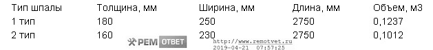 Длина шпалы 2,75 метров (2750 мм), высота 0,18 метров (180 мм), ширина 0,25 метров (250 мм).