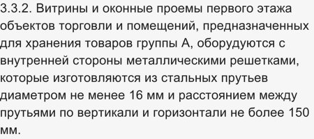 Если Вы живёте в квартире на 1 этаже, то обычно используются прутья диаметром не менее 14 мм (это минимально), а расстояние между прутьями не более 120 мм, если речь о частном доме, то не более 150 мм.