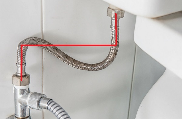 После того, как мысленно вы провели линию укладки шланга, то дальше измеряйте расстояние линейкой, рулеткой, метром или прочим измерительным инструментом расстояние от крана до штуцера с учётом загибов, если кран не смотрит в сторону штуцера (кстати в таком варианте сложнее его крепить, чем когда они смотрят в разные стороны). Вот как на рисунке: