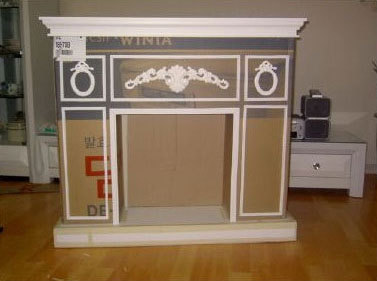 Различные геометрические статуэтки, полки, фальш-камин (не рабочий) из картонных коробок.