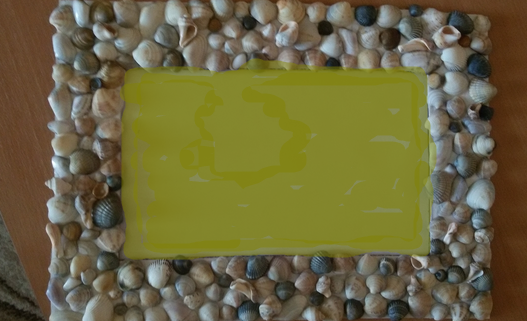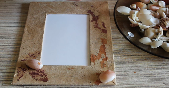 Теперь сам процесс. На макет будущей фотрамки наклеиваем ракушки. В первую очередь те, которые побольше. Затем заполняем пустые места маленькими ракушками. Если же ракушки крупные, то желательно сам картон покрасить в какой- нибудь приятный цвет, так как фон будет просвечиваться.