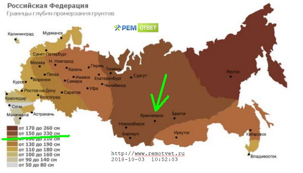Если говорить в целом, то глубина промерзания грунта в каре (Красноярском) находится в пределах от 150 и до 230 см.