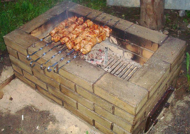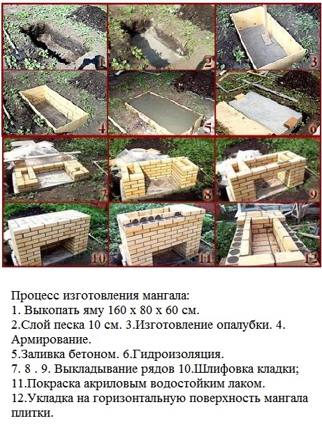 Выбираете нужную вам ширину и высоту, при выборе высоты можно ориентироваться например на стандарты рабочих столов кухонных гарнитуров, это 85 см. Берёте кирпич и начинаете кладку по выбранной схеме. По окончанию работ даёте конструкции просохнуть и приступать к эксплуатации. Можно пойти и по другому пути, т.е. сложить из кирпича только корпус, а сам мангал сварить из толстого стального листа и вмуровать в конструкцию или сделать из чугуна.