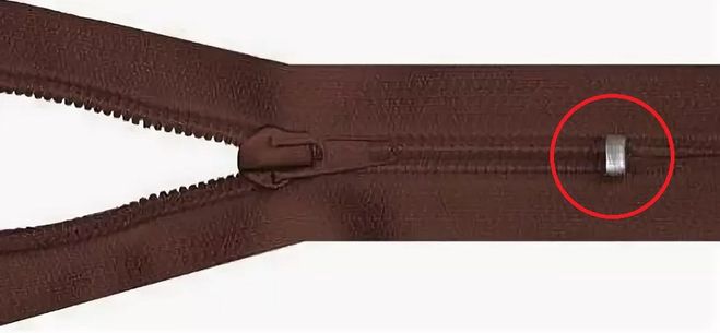 Чтобы молния легла ровно, необходимо её сначала примерит, потом начиная с верхнего края, там где она начинает расходиться, нужно прихватить её на несколько узелков, в то время, когда молния закрыта, чтобы она держалась ровно. Потом наложить временный шов по всей длине к низу с натягом, если молния длинная, то надо её укоротить, а зубчики сшить, чтобы они не расходились. Если на молнии есть стопор (на фото в красном кружке), то можно постараться переставить его, но лично у меня не получилось, плоскогубцы никак не хотели загибать ровно, поэтому просто в том месте сшил две стороны ниткой.