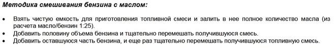 ВНИМАНИЕ! никогда не смешивайте смесь в баке бензокосы, только в отдельной таре тщательно смешивая составляющие и только потом заливайте в бак, сливайте не выработанную смесь когда оставляете косу на длительное более 2-х недель хранение, так как смесь окислится и будет непригодна для питания двигателя, её можно будет разбавить со свеже смесью но не более трети части к двум свежим.