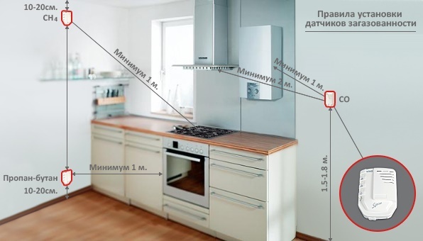 Так- если дом подключен к трубопроводу с природным газом, сенсор нужно располагать ближе к потолку. В случае с газом баллонным – ближе к полу. Объясняется это разной плотностью газообразных горючих веществ. Природный легче сжиженного баллонного варианта. При утечке он поднимается вверх, в то время как баллонный наоборот первым делом заполняет нижние уровни помещения.