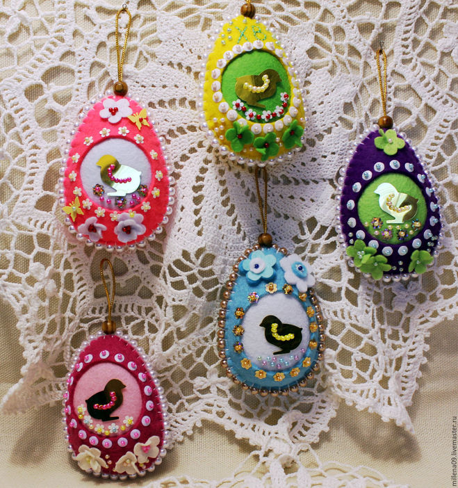 По той же самой технологии, что описана выше, можно делать заготовки яиц из фетра, но украшать их более сложным образом, используя при этом вырезанные заготовки из разноцветного фетра, или тканей, бусины, пуговицы и т.д.