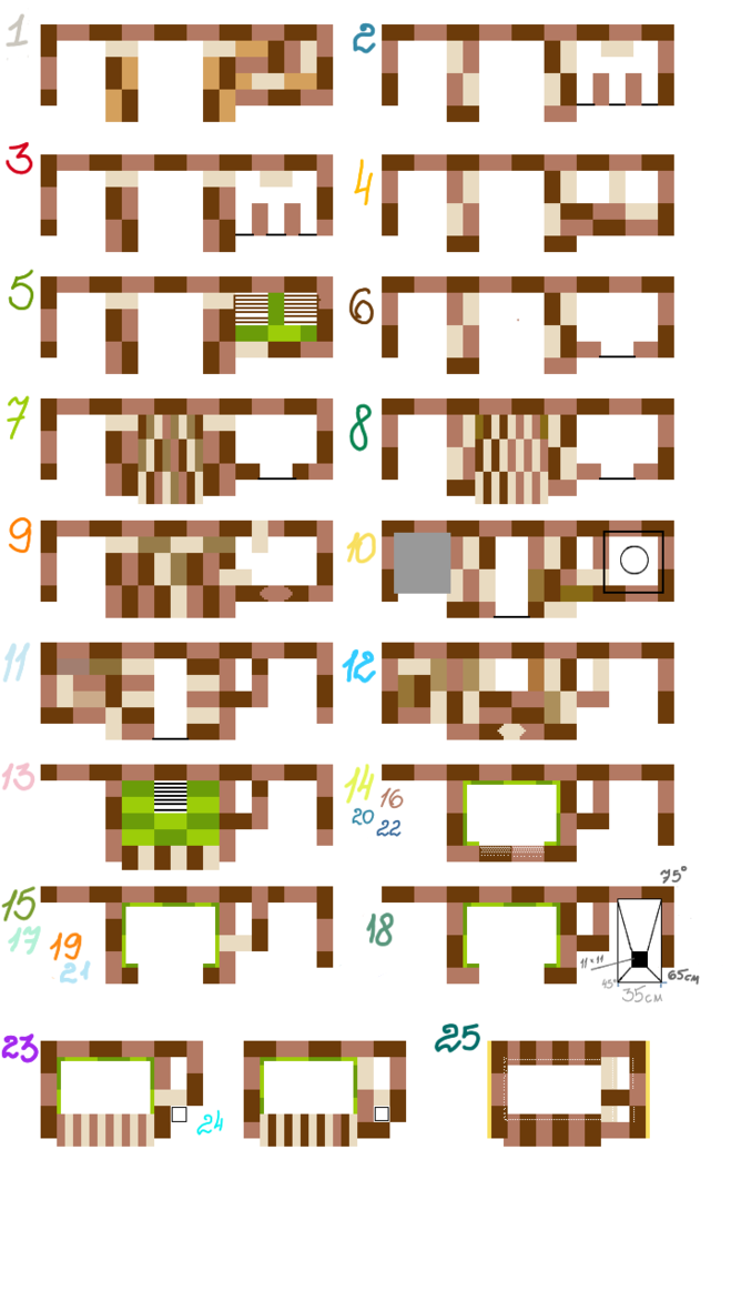 До 25 ряда зуб еще не начинается. Зеленым я обозначил огнеупорные кирпичи. Три поддувала на топке - не мой каприз, таков был эскиз, предоставленный заказчиком. Дверцу топки пришлось сместить вперед, потому что сбоку стена. Для топки и для камина предусмотрены разные дымоходы, на каждом своя задвижка.