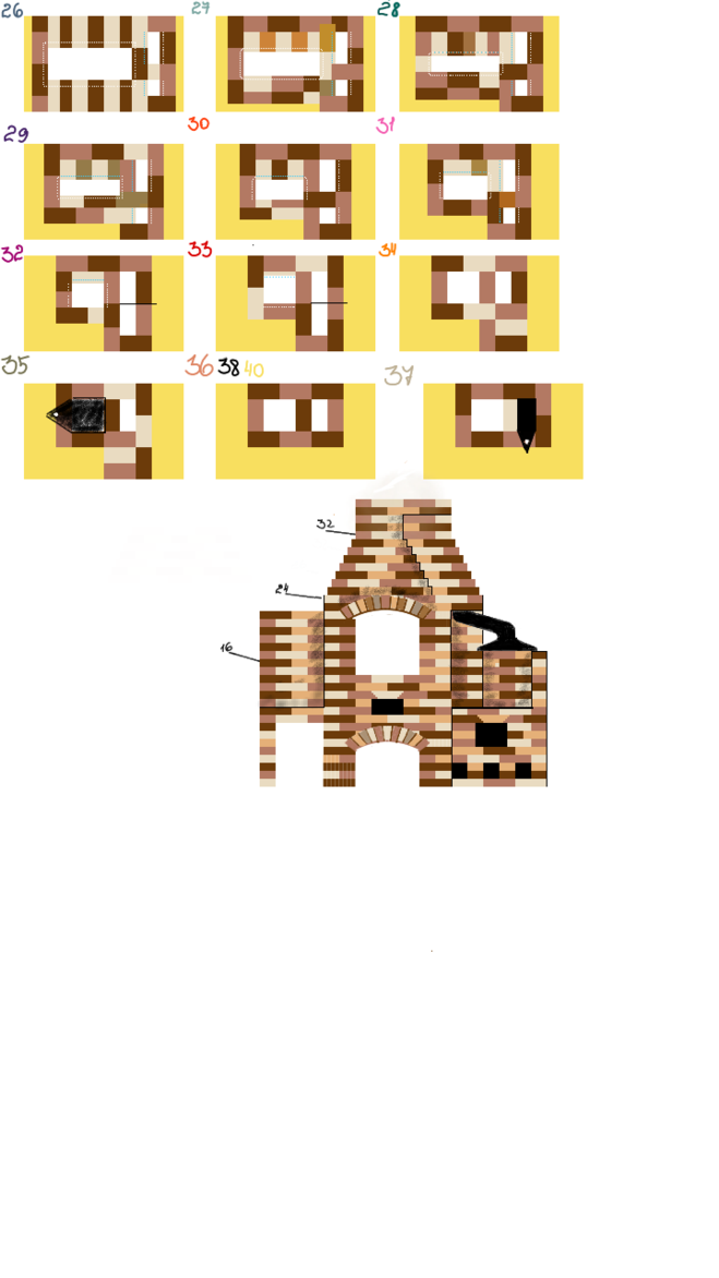 С 25 ряда начинается зуб. На каждом ряду идет смещение на четверть кирпича. Желтым обозначен изначальный контур. При смещении и устройстве зуба углы кирпичей изнутри срезаются/сошлифовываются, чтобы стенка дымохода была гладкой, а не лесенкой.