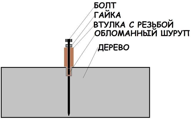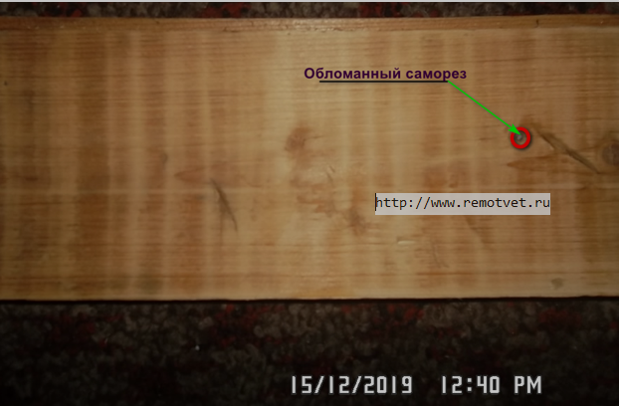 Чтобы удалить саморез, шляпка которого обломалась и ухватиться там, буквально, не за что, можно воспользоваться корончатым сверлом. Нужно просто-напросто высверлить саморез вместе с куском дерева и поставить на это место деревянную пробку.