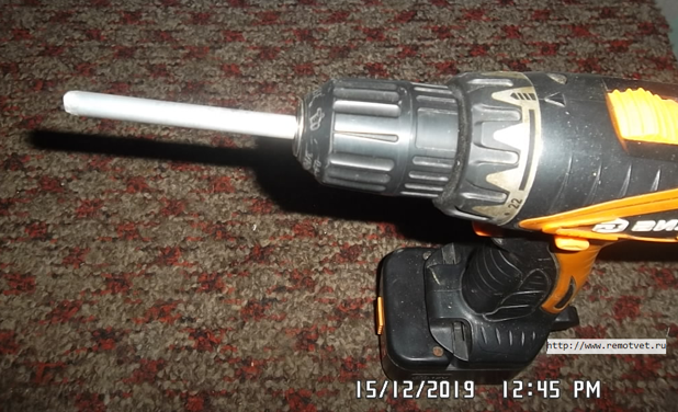 Для этого понадобится небольшой отрезок (примерно 10 см) тонкостенной трубки, один конец которой затачиваем, а внутрь другого конца забиваем стержень (подходящий по диаметру болт с обрезанной головкой, шпильку или просто круглую деревяшку). Это нужно для того, чтобы трубка не деформировалась при зажимании в патроне дрели.