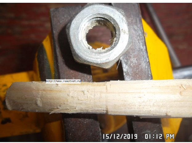 Теперь нужно в это отверстие вставить деревянную пробку. Чтобы изготовить такую пробку легко, просто, аккуратно и быстро, надо выстрогать приблизительно круглую заготовку подходящего размера и прогнать ее через гайку или толстую шайбу.