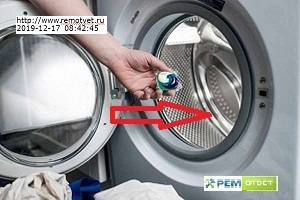 барабана (дальней от люка) затем сверху кладётся бельё.