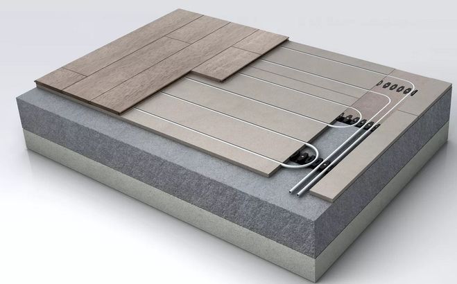 Если доска толстая можно выбрать в основании пазы далее в пазы укладывается теплораспределительные пластины, затем трубы, ГВЛ, подложка и ламинат.
