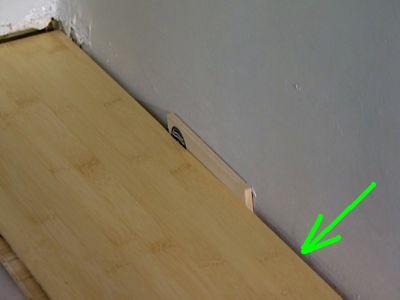 Для того, чтобы торцевой стык получился крепким и с минимальным зазором, последний ряд нужно по ходу укладки расклинивать. Для этого между ламелями и стеной загоняем деревянные или пластиковые клинья, которые сожмут ламели между собой.