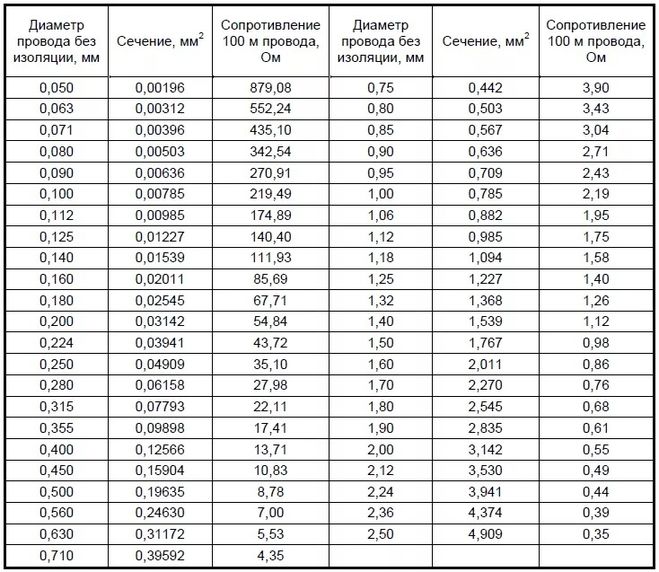 В сети интернета можно найти любые таблицы, в т.ч. и те, что позволяют вычислить сопротивление провода. Удельное электрическое сопротивление меди это 0,017 Ом*мм²/м, то же можно найти для алюминия и прочих металлов. Однако удобнее оперировать готовыми данными из таблиц.