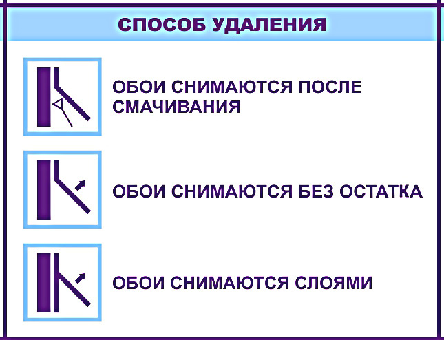 Средний символ говорит нам о том, что обои удаляются полностью (без остатка), очевидно без смачивания и нижний символ сообщает, что удаление обоев производится послойно.