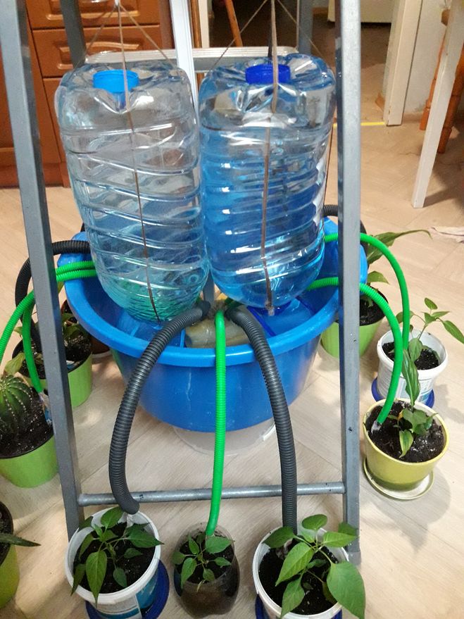Решил сам поэкспериментировать - испытать способ с емкостью с водой, в которую опускаются полоски из ткани, а другой конец закрепляется в горшках с растениями.