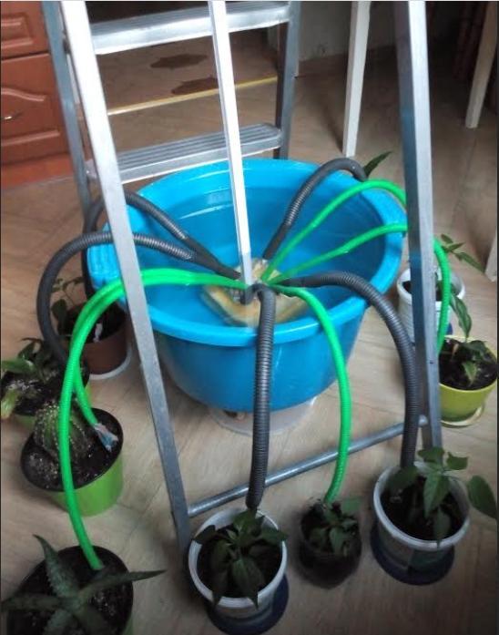 - Емкость с водой (миску) нужно поднимать выше, чтобы концы трубок, находящиеся в воде, были выше уровня земли в горшках.