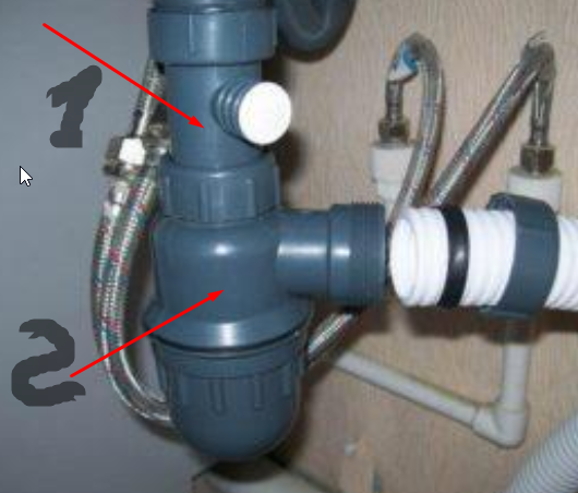Далее открутите (послабьте) 2 гайки части сифона с патрубком и разверните патрубок к стене.
