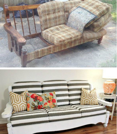 Приведём фотографии таких декоров, возможно вы найдёте что-то подходящее для себя. Вот такой диван может получиться, если его покрасить и обшить подушки. По мне, Такой диван прослужит ещё очень долго и будет радовать вас.