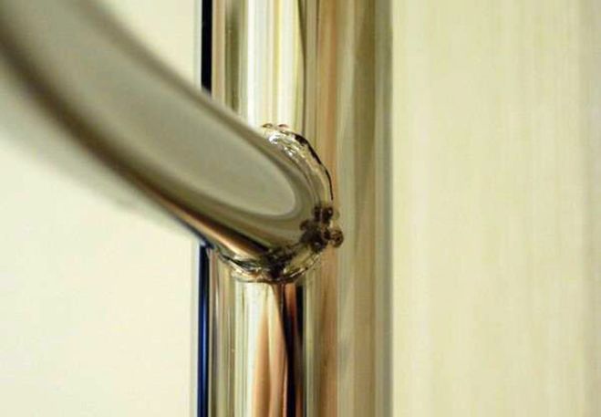Аналогичная ситуация случилась и у меня, когда установив полотенцесушитель отечественного производства он потек спустя три года. Я честно говоря недоумевал от такой ситуации и решив перестраховаться заменил на новый другой конструкции и другого производителя. А вышедший из строя как я полагал полотенцесушитель решил разрезать, чтобы изучить более детально причину появления свища. Я был очень расстроен, когда разрезав мой полотенцесушитель сделанный из нержавеющей трубы с толщиной стенки 4 мм. Он оказался абсолютно целым, только в одном месте, из-за дефекта металла в виде вкрапления инородной частички черного металла он начал течь.