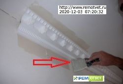 Затем шпаклюем щели между плинтусом и потолком, а так же плинтусом и стеной (и в углах, после подрезки, при необходимости), просушка.