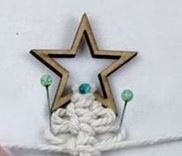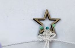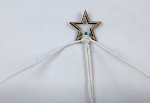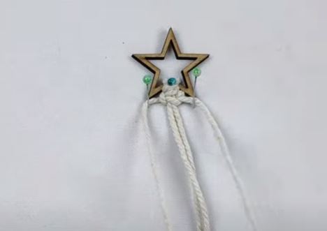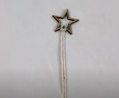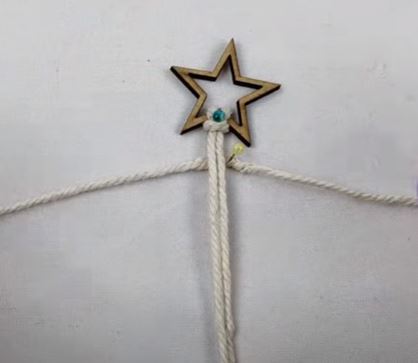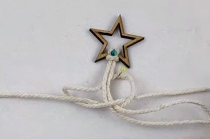 Для начала находим небольшой предмет в виде звездочки, находим веревку длинной 30 см, складываем ее пополам и продеваем через звездочку. Должно получиться так: