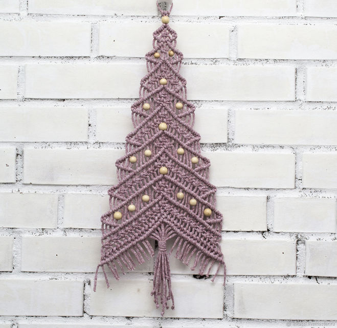 В завершении с помощью тугих узлов делаем ствол елочки. Остается только отрезать лишнюю веревку, концы смазать клеем.