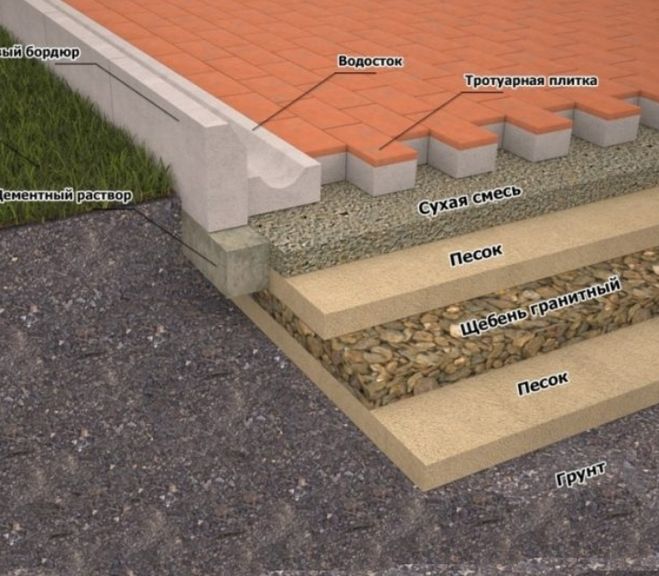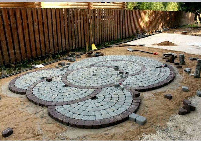 В любом случае, соблюдается вся последивательность процесса: удаление плодородного слоя, трамбовка песчаной подушки, щебеночной, устройство подушки из смеси песка с цементом 1к4, укладка, засыпка швов и монтаж бордюра
