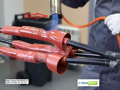 Далее термоусадочная трубка нагревается при помощи газовой горелки