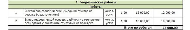 - геологические и геодезические работы, включающие в себя изучение грунтов и подземных вод на строительном участке, анализ грунтовых проб, привязка дома к местности, закрепление реперов. В ниже приведенной таблице указаны расценки в украинской гривне для дома средней квадратуры – 250м.кв.