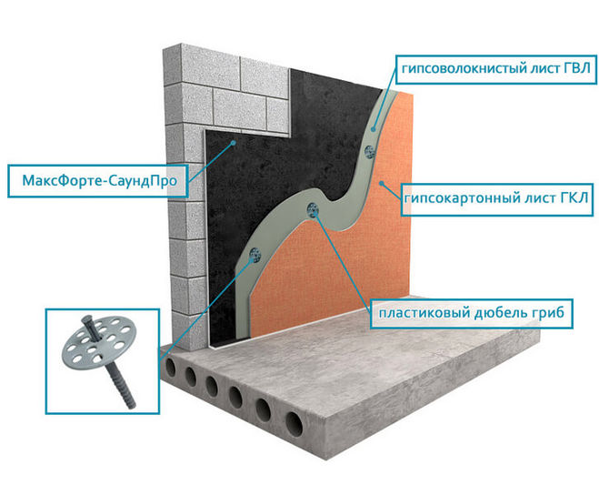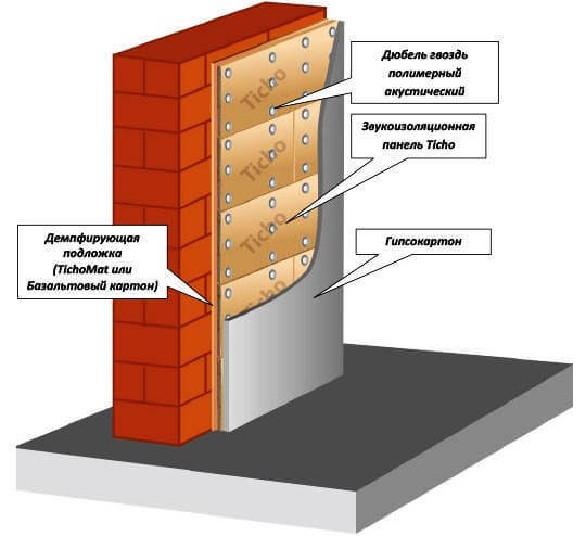 На стене закрепляется демпферная прокладка (толщина 3-4мм), на которую с помощью акустических полимерных дюбелей устанавливаются акустические панели (фонстар, соноплат и др., толщина 8-22мм) с внутренним минеральным наполнением. Стыки герметизируются герметиком. Шумоизоляция закрывается гипсокартонном на клею или прикручивается саморезами.