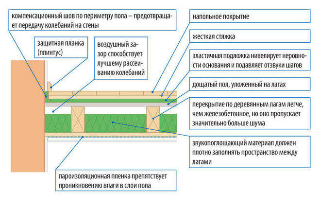Чтобы изолировать пол от ударного и воздушного шума устраивают плавающие полы.
