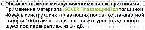 На очищенное от мусора перекрытие укладывается упругая звукоизоляция толщиной 3-4см. Подбирая материал для звукоизоляции, нужно смотреть, чтобы в технической характеристике на товар было указано, что он подходит для укладки под стяжку, например так:
