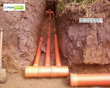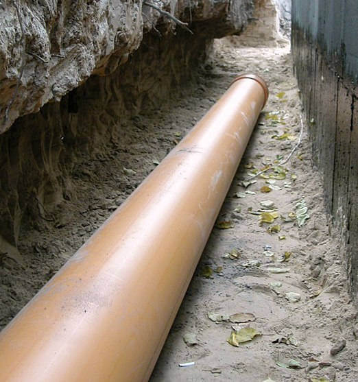 Для устройства теплообменника, трубу диаметром 200-250мм (обычно тонкостенные ПВХ) укладывают в подготовленную траншею. Выгодно укладывать трубу в готовом котловане возле смонтированного фундамента, чтобы не рыть отдельную траншею.