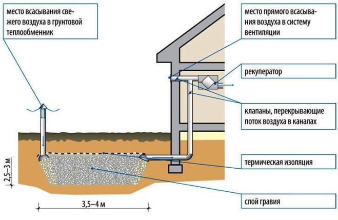 Чтобы сэкономить на подогреве холодного свежего воздуха зимой и охлаждении горячего воздуха летом в рекупираторах для вентиляции, устраивают грунтовые теплообменники. Воздух в рекупираторы поступает с улицы, пройдя по трубе, уложенной в земле, ниже точки промерзания.