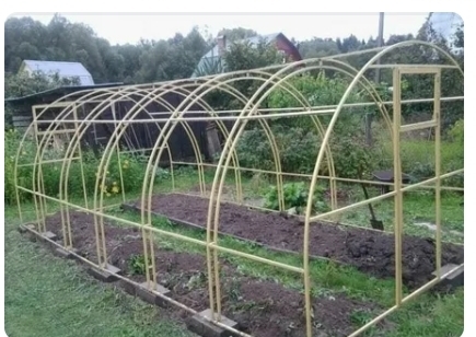 Каждая арка специально состоит из двух прутков, чтоб просунуть между ними сотовый поликарбонат и не крепить его на саморезы. А вот сечение прутков на фото маловатое, и расстояние лучше сократить.