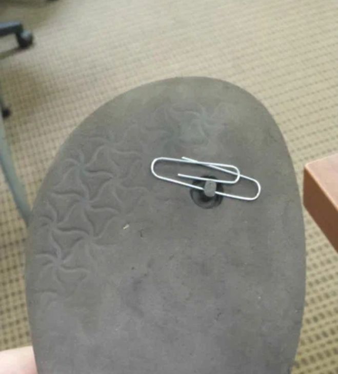 Если перемычка выдернулась из подошвы, разболтав крепежное отверстие, то можно её зафиксировать временной фиксацией при помощи скрепки или булавки: