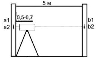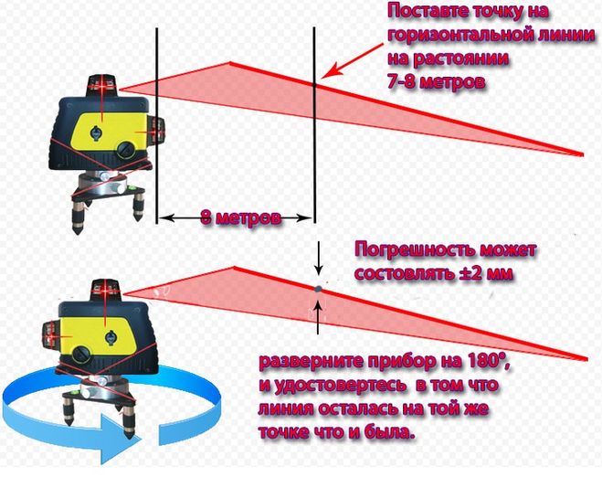 В этом случае прибор устанавливают на расстоянии 8 метров от стены, отмечают точку и крутят уровень на 180 градусов, отмечают вторую точку и опять на 180 градусов разворачивают. Если точки совпали, можно высчитывать разницу между первой и второй точкой, это и будет отклонение.