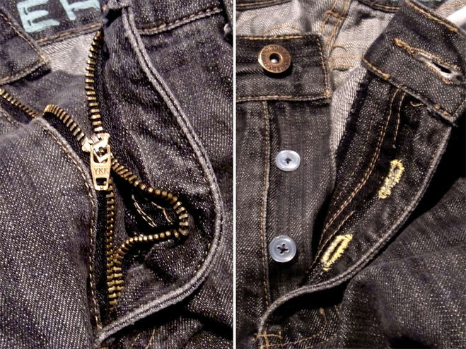 Самый популярный и простой вариант чем заменить молнию на джинсах - металлические пуговицы. Застёжка на пуговицах была в тренде некоторое время назад. При этом пуговицы, или по-другому на сленге их называли "болты", были просто пришиты к нижней части гульфика (застёжки), а петли пробивались на верхней. Сегодня так не делают. Но пуговицы можно сделать незаметными: пришить их к специальному слою ткани, прикрепленному к одной из сторон застёжки.